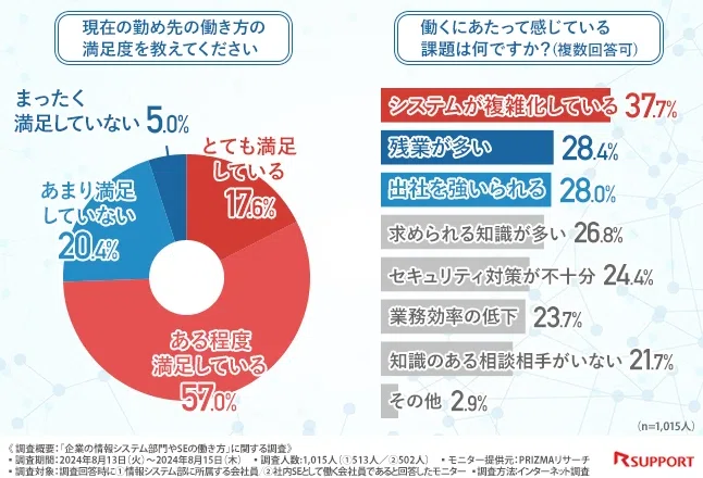 システムが複雑化していることや残業が多いこと、さらには出社を強いられるといった課題を感じている方が多いようです。