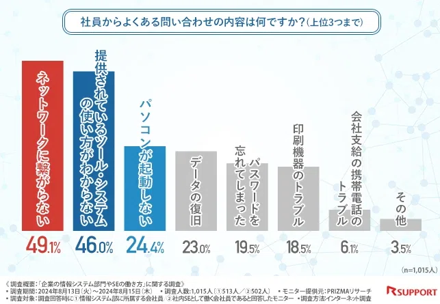 また、ツールやシステムの使い方や、パソコンの起動に関する質問も社員からよく寄せられることも判明しました。