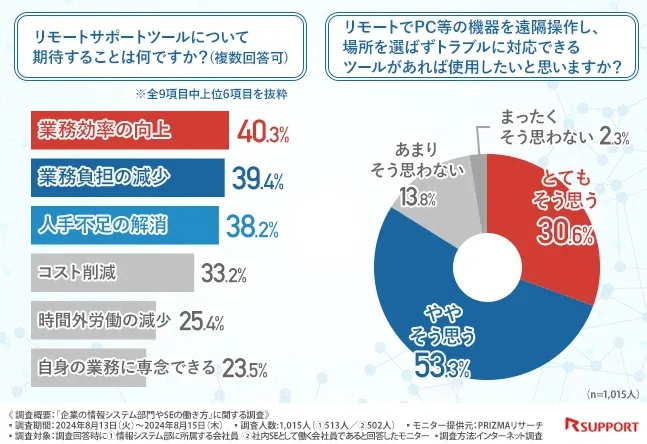 そのような現状から、リモートサポートツールには業務効率の向上や業務負担の減少、人手不足の解消を期待しており、8割以上の方がリモートでPC等の機器を遠隔操作してトラブルに対応できるツールがあれば使用したいと考えていることが判明しました。