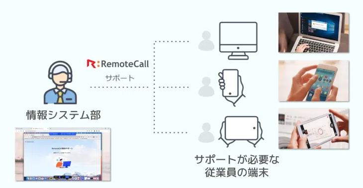 「RemoteCall」は、お客様のPCやモバイルにリモートで接続し、デバイスの画面や現場の状況を直接見ながら問題を解決できるソリューションです。