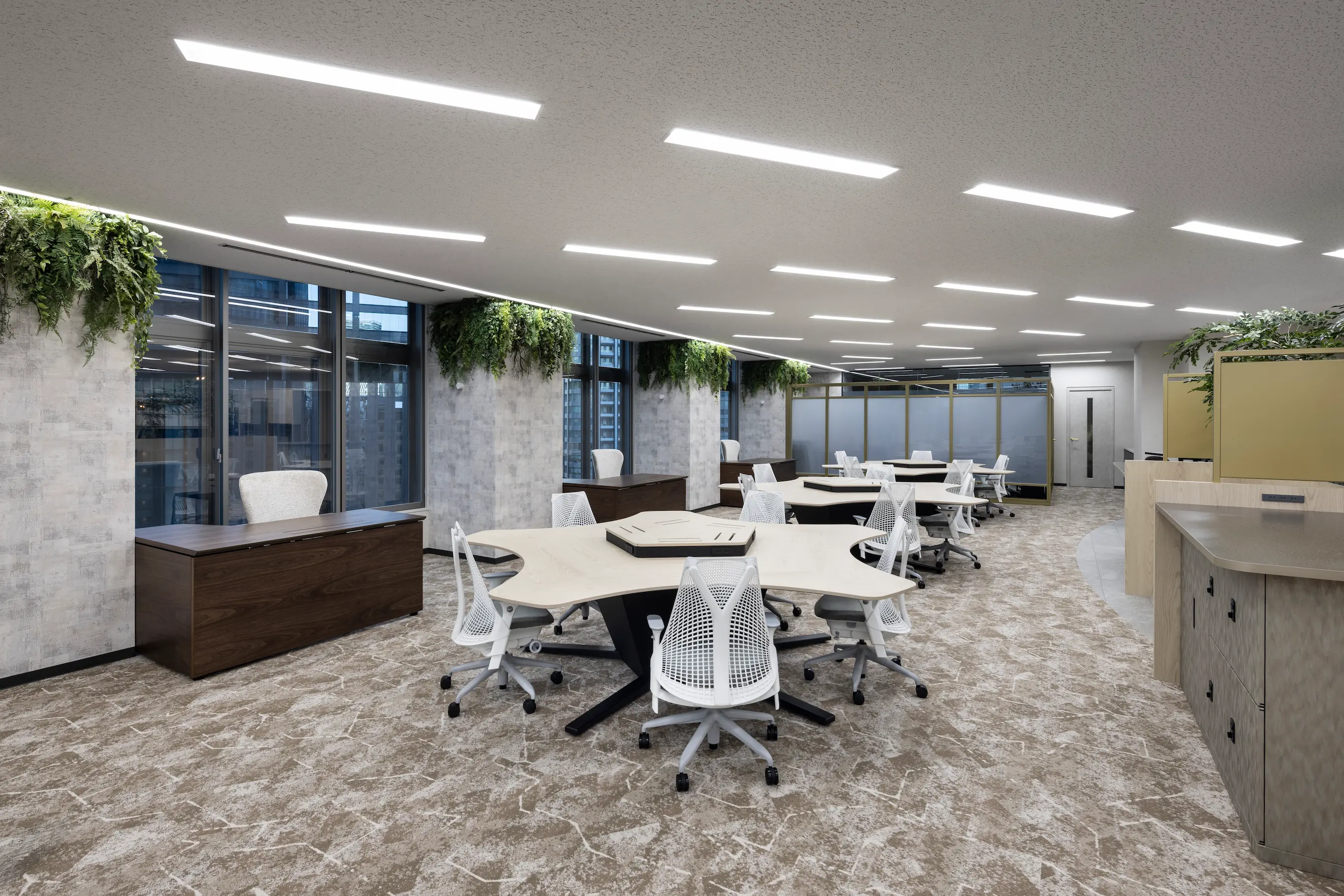 会社に根を張り、一本の木から森へと繁栄し、やがて大きな頂点に到達する会社の未来を表現し、オフィスにはグリーンを多く取り入れています。