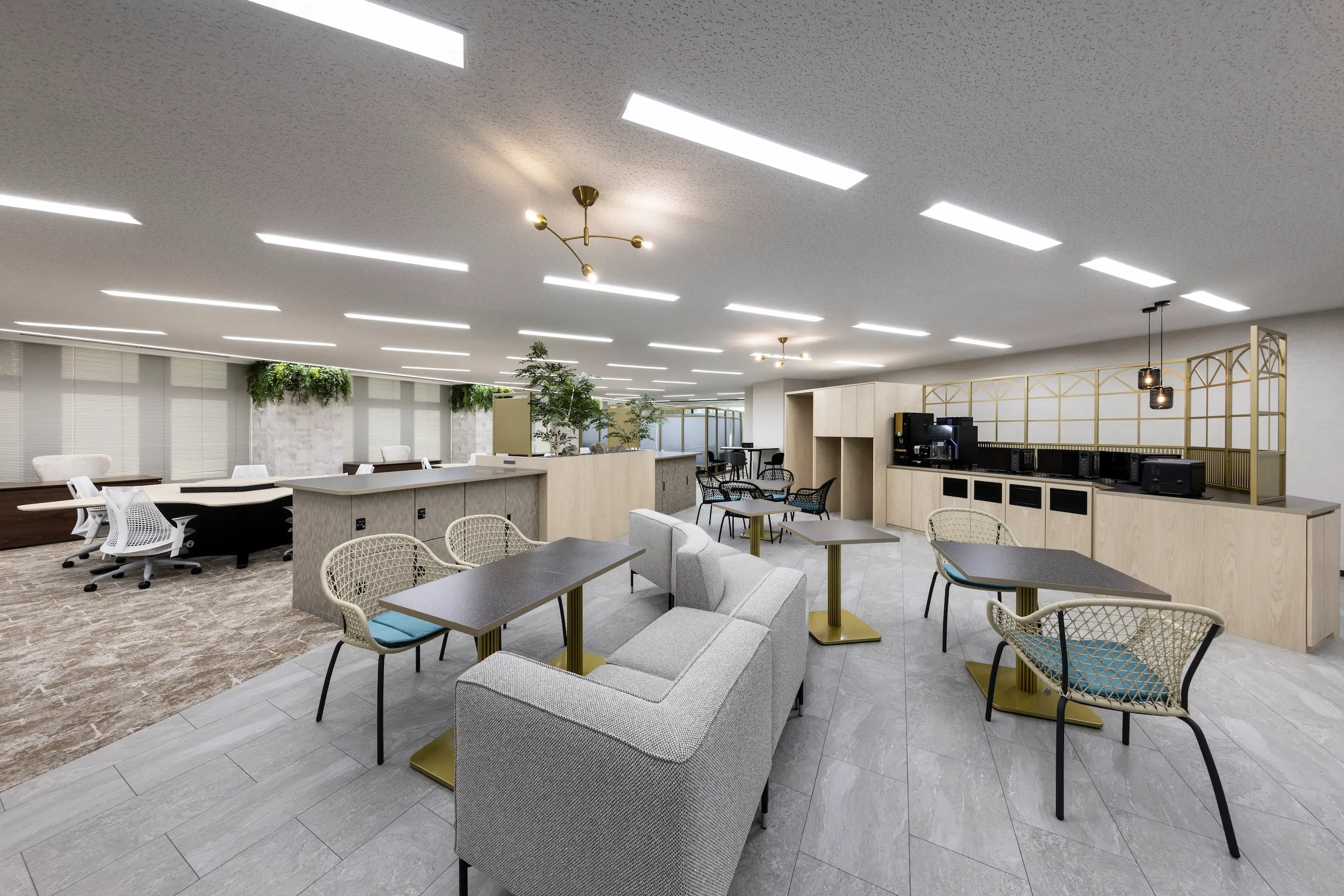 メンバー同士がコミュニケーションをとりやすいように部門間の壁がないレイアウトにし、社内一面に交流や情報共有の場が広がります。